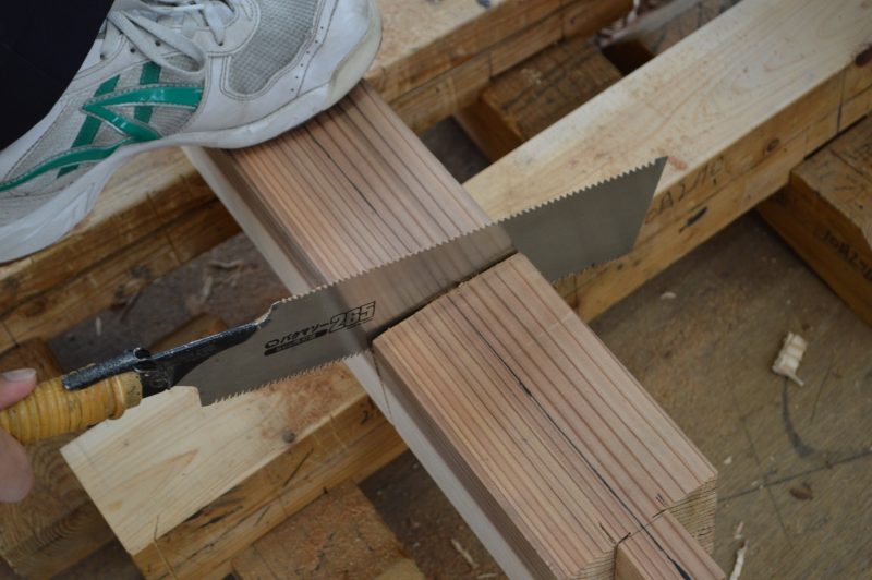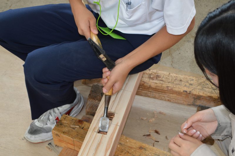 建築科を体験した12名の中学生。短ボソ制作を体験。二つの木材を凹凸上に掘り込み、つなぎ合わせるという工程を体験しました。先輩たちの手ほどきのもと、無事に完成。恐る恐るのみをふるう姿。失敗は許されません。木材がしっかりとかみ合ったときは感動しますね。