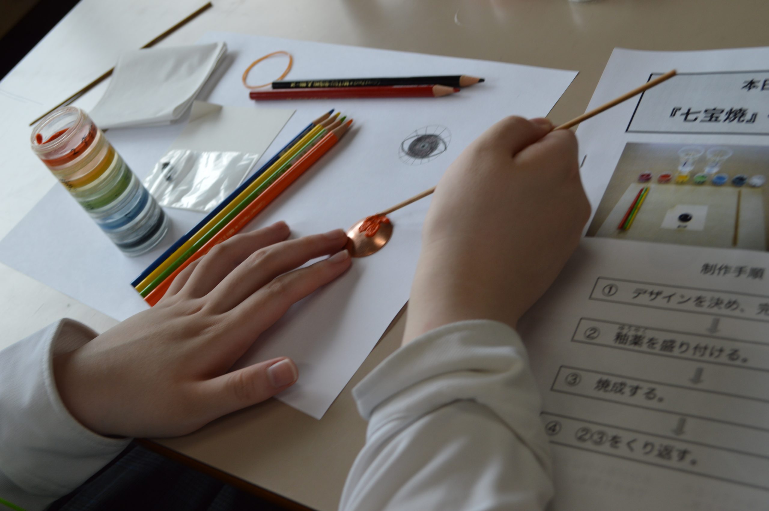 美術コース体験では七宝(しっぽう)焼きを体験。直径3センチの銅板にガラスのうわぐすり(釉薬)を焼き付けた工芸品を制作。美しい色彩が特徴で奈良時代より伝わる工芸品です。