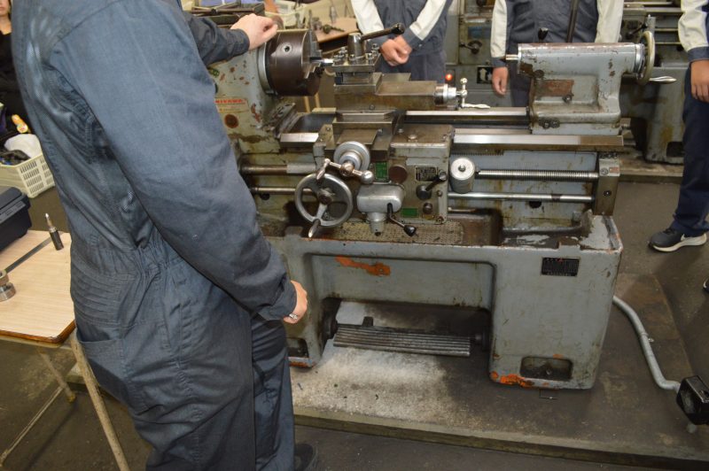 旋盤とは鉄を削る技術です。10ミリの鉄の棒を5ミリに削る。ミリ単位の誤差を調節。集中して旋盤に挑みました。